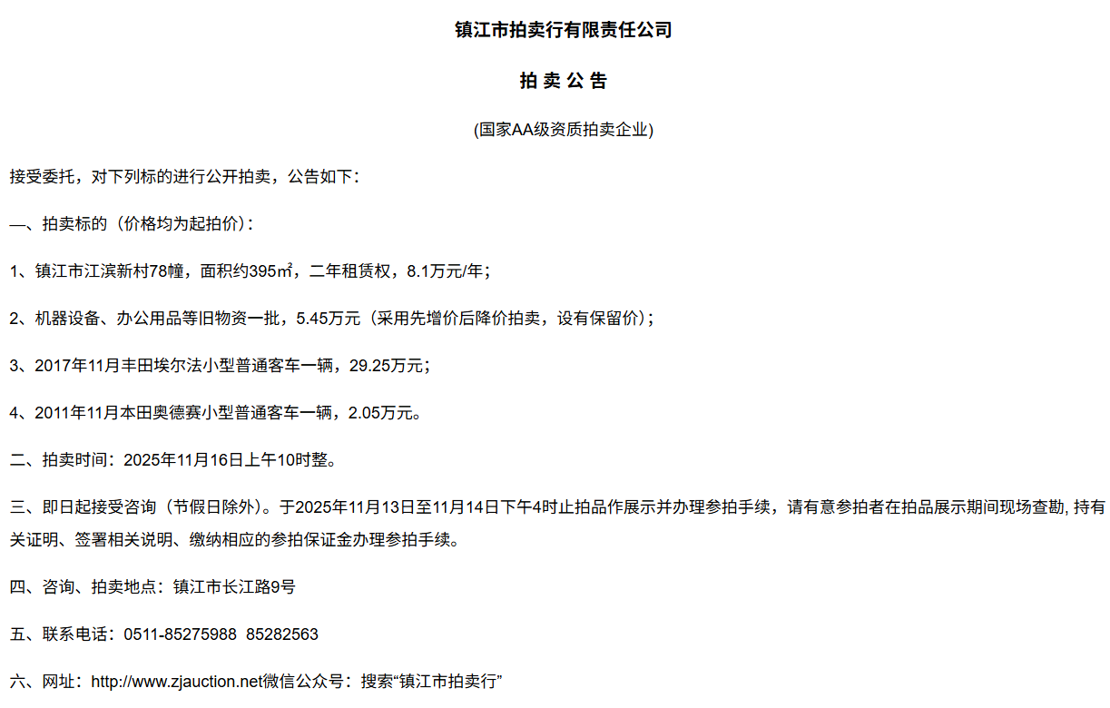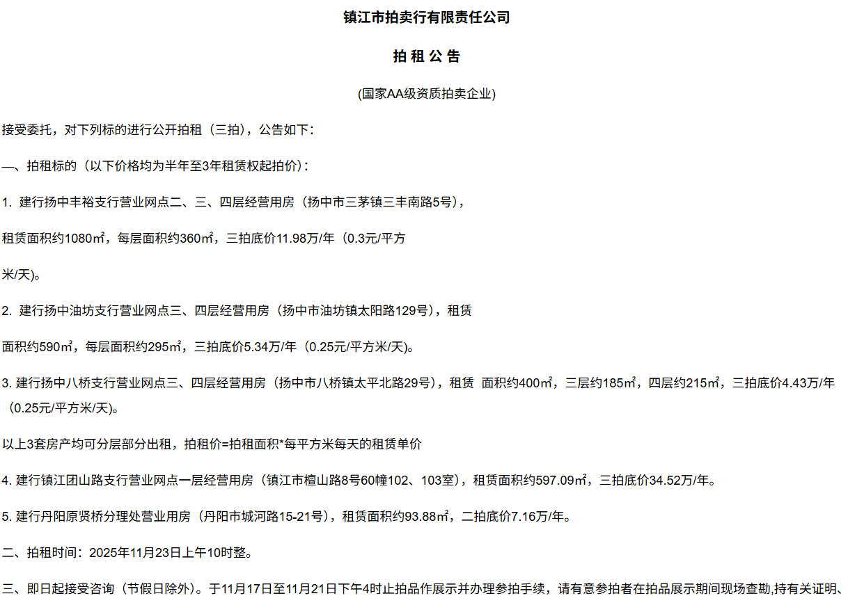 鎮江市拍賣行有限責任公司拍 租 公 吿(國家AA級資質拍賣企業)接受委托,對下列標的進行公開拍租(三拍),公告如下:—、拍租標的(以下價格均為半年至3年租賃權起拍價):1.  建行揚中豐裕支行營業網點二、三、四層經營用房(揚中市三茅鎮三豐南路5號),租賃面積約1080㎡,每層面積約360㎡,三拍底價11.98萬/年(0.3元/平方米/天)。2.  建行揚中油坊支行營業網點三、四層經營用房(揚中市油坊鎮太陽路129號),租賃面積約590㎡,每層面積約295㎡,三拍底價5.34萬/年(0.25元/平方米/天)。3. 建行揚中八橋支行營業網點三、四層經營用房(揚中市八橋鎮太平北路29號),租賃  面積約400㎡,三層約185㎡,四層約215㎡,三拍底價4.43萬/年(0.25元/平方米/天)。以上3套房產均可分層部分出租,拍租價=拍租面積*每平方米每天的租賃單價4. 建行鎮江團山路支行營業網點一層經營用房(鎮江市檀山路8號60幢102、103室),租賃面積約597.09㎡,三拍底價34.52萬/年。5. 建行丹陽原賢橋分理處營業用房(丹陽市城河路15-21號),租賃面積約93.88㎡,二拍底價7.16萬/年。二、拍租時間:2025年11月23日上午10時整。三、即日起接受咨詢(節假日除外)。于11月17日至11月21日下午4時止拍品作展示并辦理參拍手續,請有意參拍者在拍品展示期間現場查勘,持有關證明、簽署相關說明、繳納相應的參拍保證金辦理參拍手續。四、咨詢、拍租地點:鎮江市長江路9號五、聯系方式:0511-85275988   13655299933楊先生六、網址:http://www_zjauction_net.pzh188.cn;微信公眾號:搜索“鎮江市拍賣行” 拍品清單2025.11.23序號名稱起拍價(元)標的說明1建行揚中豐裕支行營業網點二、三、四層經營用房(揚中市三茅鎮三豐南路5號),租賃面積約1080㎡,每層面積約360㎡三拍底價11.98萬/年(0.3元/平方米/天)1、1-3號房產均可分層部分出租,拍租價=拍租面積*每平方米每天的租賃單價;2、意向競拍人在拍賣前需持營業執照或身份證與委托方說明租賃房產經營業態,確定意向后出具房產承租用途承諾書,經委托方審核后,方可交納保證金參加競拍;3、租賃期限為半年至3年(承租方與出租方協商而定),承租方每半年或一年結付租金,租賃期間的水、電費用及其它相關費用均由承租方承擔;4、承租方不得用于經營和保管危險物品,不得用于開設餐飲、娛樂等可能嚴重影響消防安全、運營安全的經營業態,不得用于經營委托貸款、小額貸款等可能冒用委托方名義,帶來聲譽風險的經營業態。租賃期內,承租方不得破壞墻體結構,自行成就消防、安全等使用條件,不得擅自將租賃房屋轉租、轉讓給他人使用,否則委托方有權收回房屋;5、拍租成交后,承租方將租金交至出租方指定賬戶,傭金交至拍賣方賬戶(拍租傭金為該房屋一個月租金)。承租方憑租賃合同無息退還保證金。2建行揚中油坊支行營業網點三、四層經營用房(揚中市油坊鎮太陽路129號),租賃面積約590㎡,每層面積約295㎡三拍底價5.34萬/年(0.25元/平方米/天)3建行揚中八橋支行營業網點三、四層經營用房(揚中市八橋鎮太平北路29號),租賃面積約490㎡,每層面積約245㎡三拍底價4.43萬/年(0.25元/平方米/天)4建行鎮江團山路支行營業網點一層經營用房(鎮江市檀山路8號60幢102、103室),建筑面積約597.09㎡三拍底價34.52萬/年5建行丹陽原賢橋分理處營業用房(丹陽市城河路15-21號),建筑面積約93.88㎡二拍底價7.16萬/年